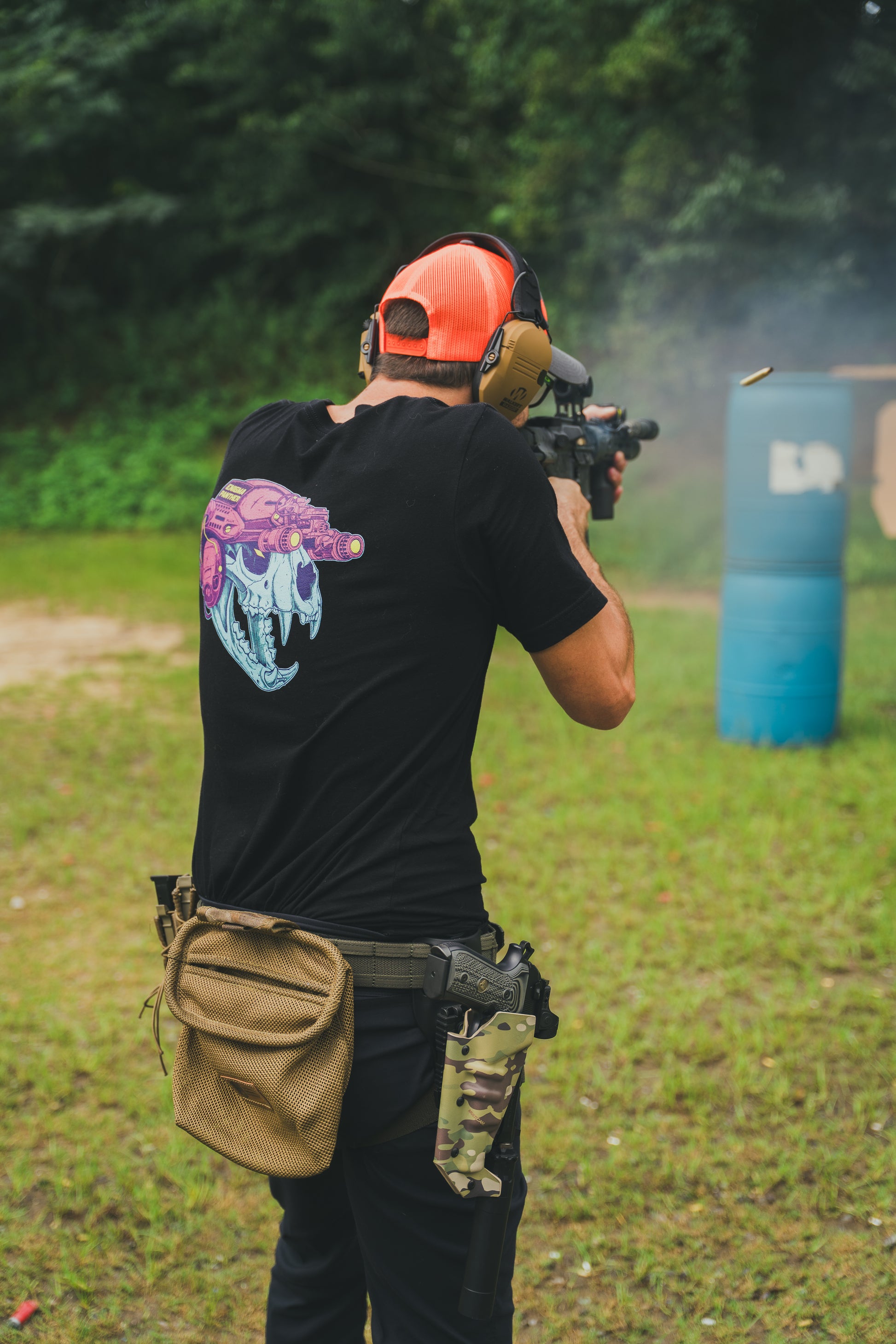 Retro With Teeth – 80s neon meets today’s warrior. The skull, the nods, the lines — clean but deadly.